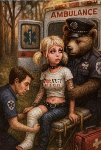After watching television and leaving large amounts of food debris throughout the house, including on a very expensive plush, leather settee, she explored the upstairs bedrooms and fell asleep under blankets on the youngest child’s loft bed. Mr Bare returned with his family, wife Mumme and 6-year-old son, Bae at 9:45 p.m. and discovered the catastrophic scene. His son’s screams brought the father upstairs, where a melee ended with the startled intruder tumbling down the stairwell and fracturing her leg.